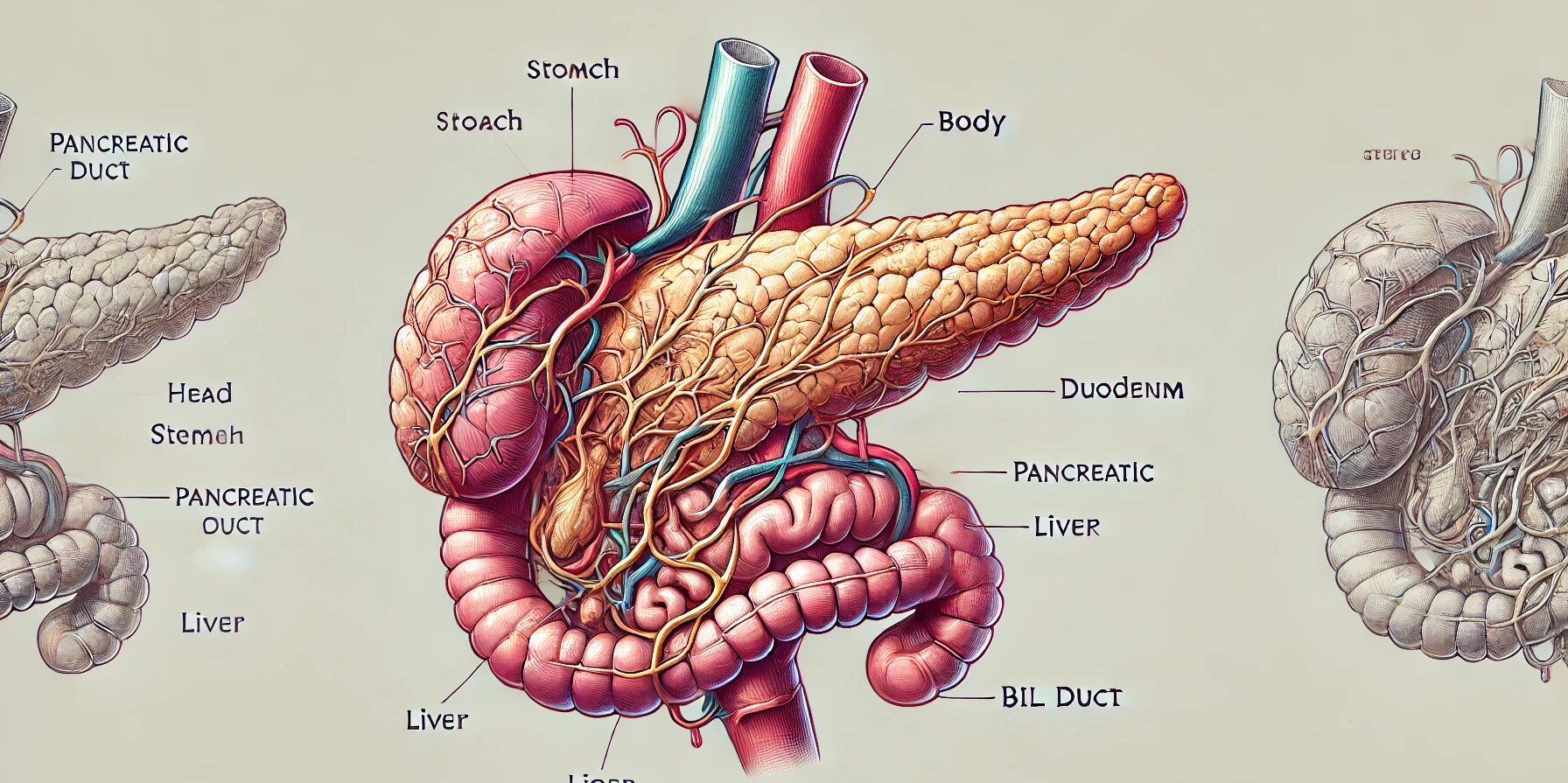 췌장은 위장 바로 뒤, 척추 앞에 위치한 길고 평평한 분비샘입니다. 소장의 첫 번째 부분인 십이지장의 만곡부에 자리 잡고 있습니다. 해부학적으로 췌장은 머리, 몸통, 꼬리로 구분됩니다. 췌장의 머리는 십이지장에 부착되어 있고 꼬리는 비장 근처의 배 왼쪽으로 뻗어 있습니다. 체내에서의 췌장의 위치는 두 가지 이유로 중요합니다.